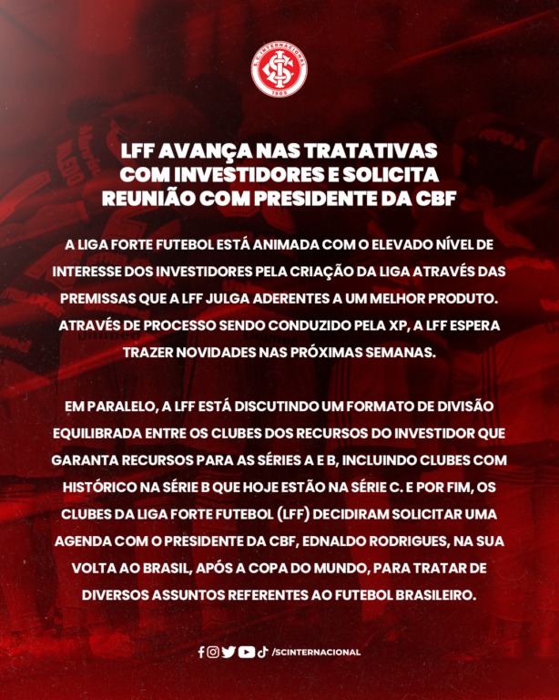 Foto: Divulgação / S. C. InternacionalNesta segunda-feira (05) o Inter divulgou uma atualização referente a LFF, que deve se reunir com o Presidente da CBF, Ednaldo Rodrigues, após o Mundial do Qatar.