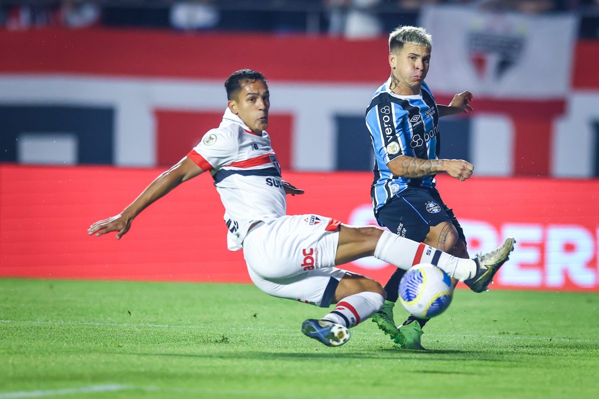 Lucas recebeu na entrada da área. Livre, teve tempo para dominar e acertar um preciso chute rasteiro, no canto direito, para que os são-paulinos comemorassem a abertura do placar. Os donos da casa não foram intensos e dominantes até o fim, mas podiam ter descido ao intervalo com vantagem maior. O Grêmio só respondeu nos acréscimos, sempre em jogadas originadas dos pés de Soteldo, o mais criativo e lúcido dos gremistas.
