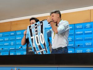 Antes da entrevista, Renato foi homenageado pelo presidente Alberto Guerra pelos 700 jogos com a camisa tricolor, incluindo partidas disputadas como jogador e treinador. O comandante tricolor recebeu das mãos do presidente uma camisa com seu nome e o número 700 atrás, além de uma placa com uma homenagem de Guerra.